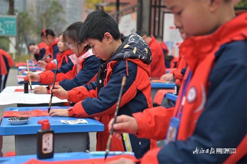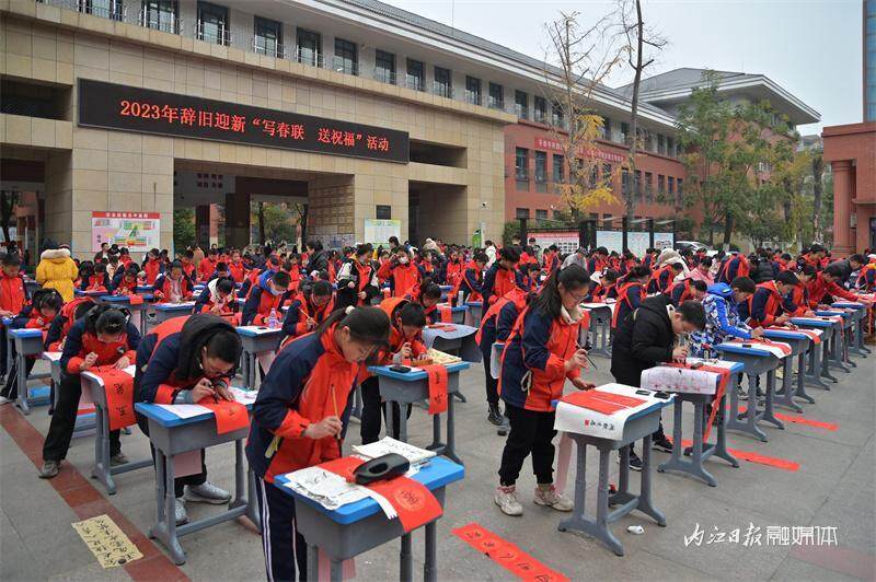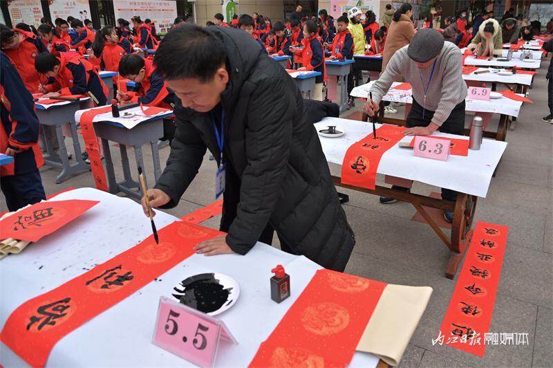 12月28日,在2024年元旦节来临之际,内江市桐梓坝小学校举行2023年辞旧迎新“写春联、送祝福”活动,吸引了爱好毛笔书法的师生家长200余人参加。