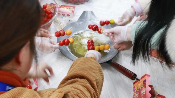 冬天的冰糖葫芦是一种特别的存在,是酸甜可口的美食,更是对童年最美的记忆。冬天的到来让这份美好和仪式感从冰糖葫芦开始悄然而生!洗净的山楂、金桔、圣女果、竹签...整齐摆放在桌,大家先用竹签将山楂串起来,之后讲制作好的葫芦串裹上熬制好的糖浆,时不时讨论展示,每个人脸上都洋溢着幸福的微笑。