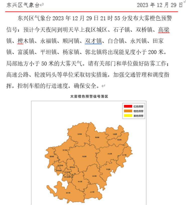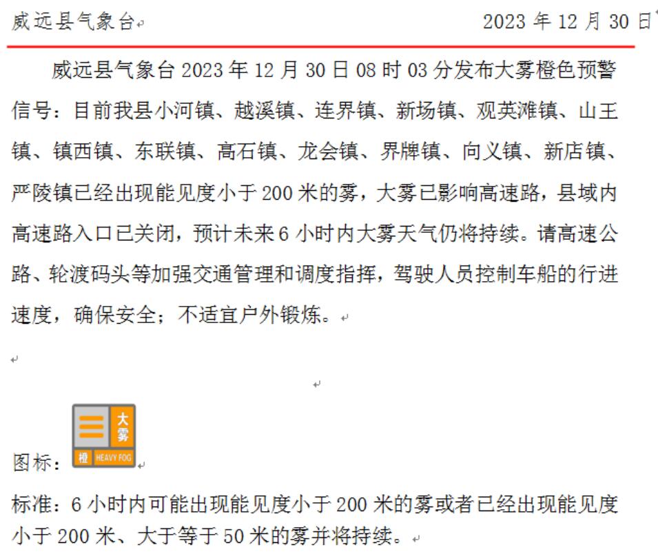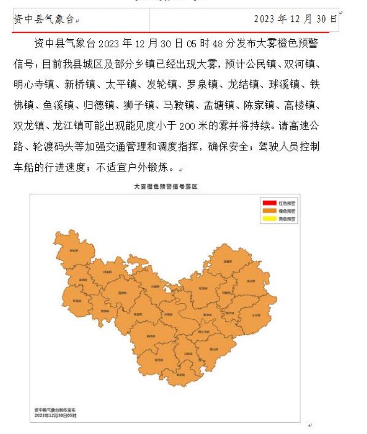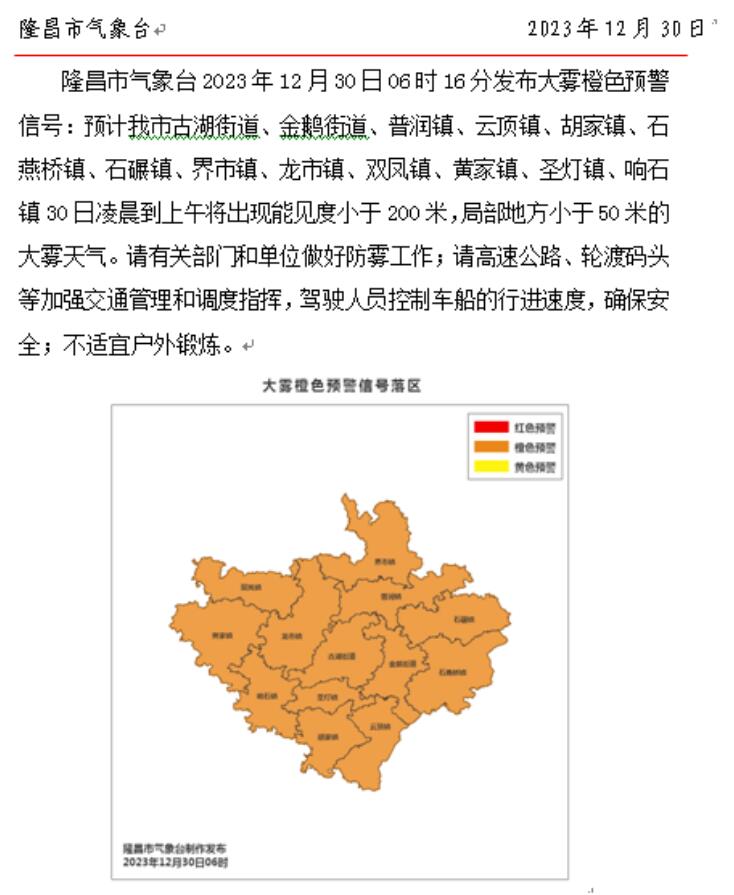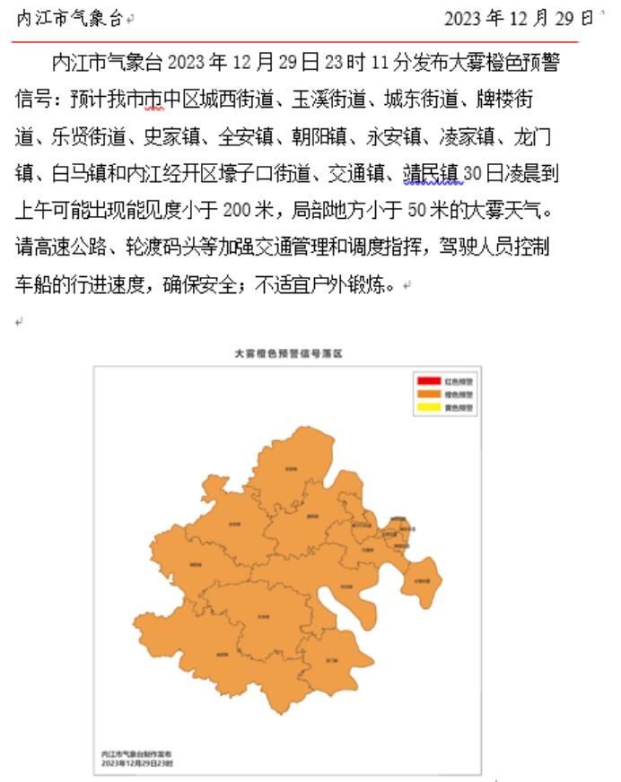 时间:2023-12-30 08:13:56 来源:内江市气象台、东兴区气象台、四川省公安厅交通警察总队高速公路三分局二大队等江粉儿从内江市气象台、东兴区气象台、隆昌市气象台、资中县气象台、威远县气象台获悉,内江多地发布大雾橙色预警信号,详情如下。