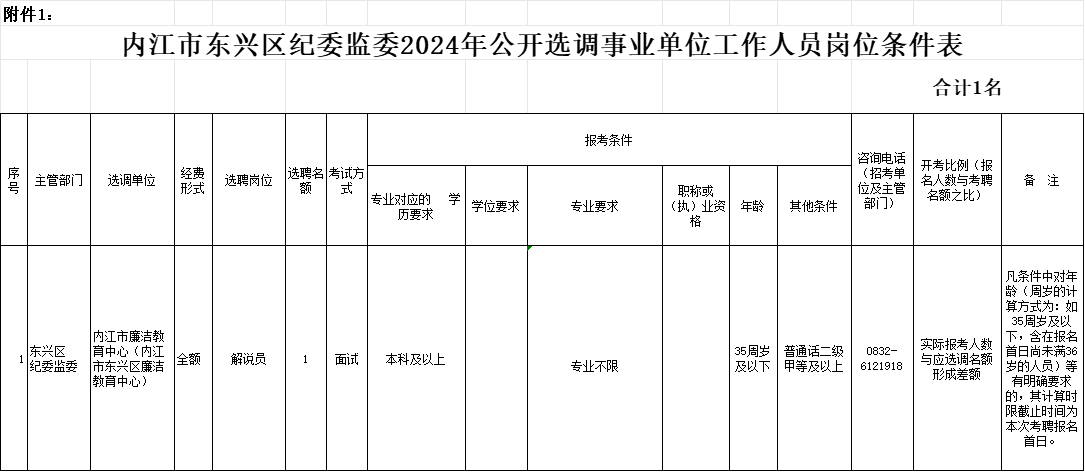 内江市廉洁教育中心(内江市东兴区廉洁教育中心)干部1名。