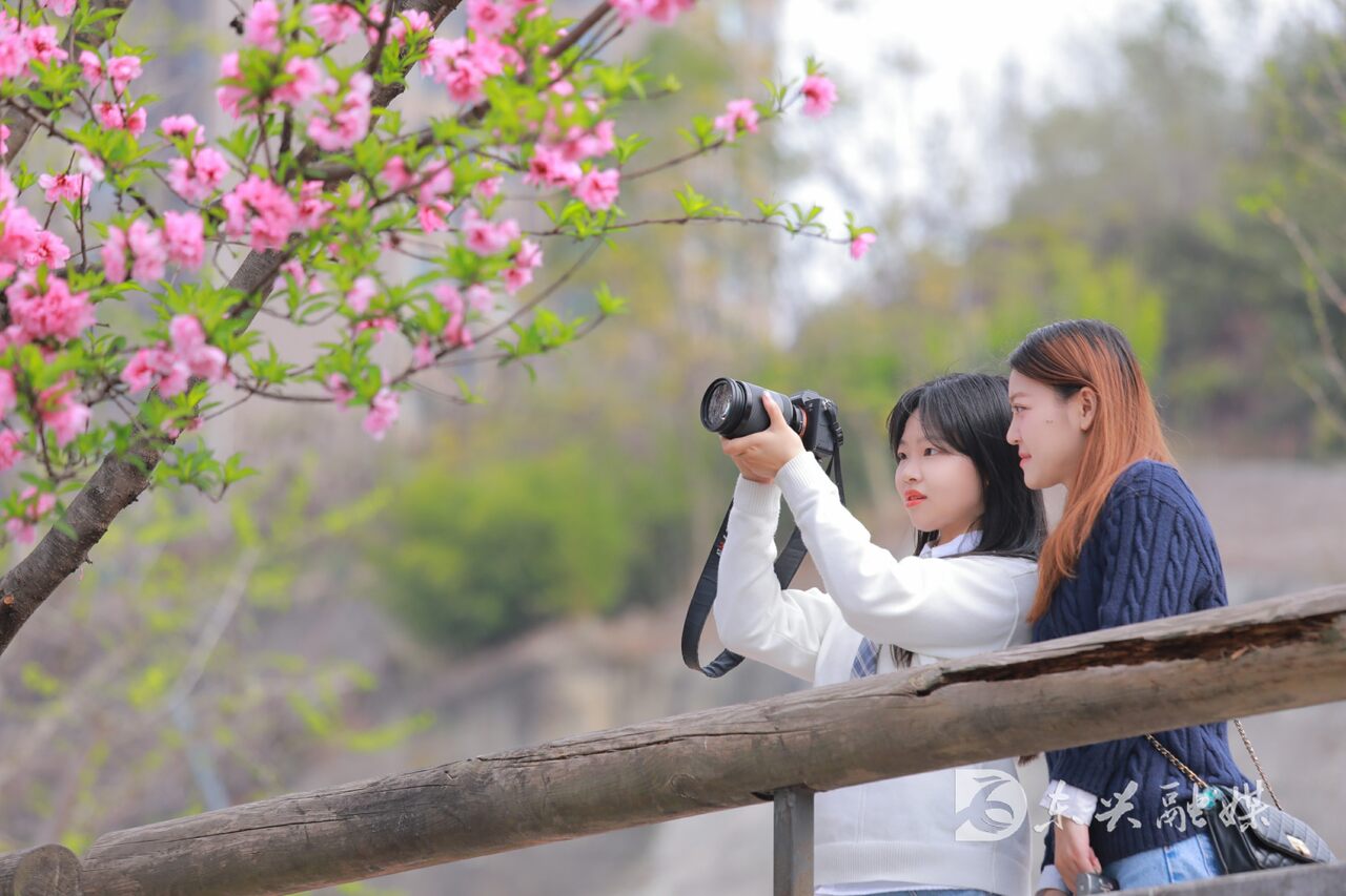 “网红树”是一棵碧桃树,碧桃万树天地春, 红云香阵正萦人。枝丫杈间,碧桃花簇拥成串,傲然盛放,红色的妖娆动人,如诗如画,极尽浪漫。