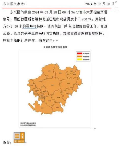 目前我市东兴区和隆昌市部分地方已经出现能见度小于500米,局部小于200米的大雾天气,预计将持续,请高速公路、轮渡码头等加强交通管理和调度指挥,驾驶人员控制车船的行进速度,确保安全;不适宜户外锻炼。