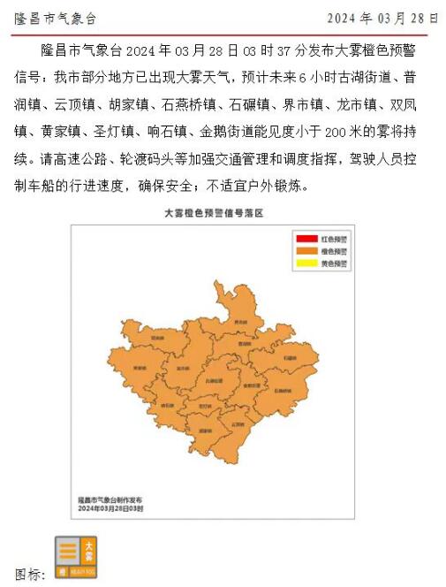 时间:2024-03-28 08:46:37 来源:内江市气象台 四川高速交警3月28日,内江市气象台发布大雾短时临近天气预报,东兴区气象台、隆昌市气象台发布大雾橙色预警信号,内江多个高速站口临时关闭,详情如下。