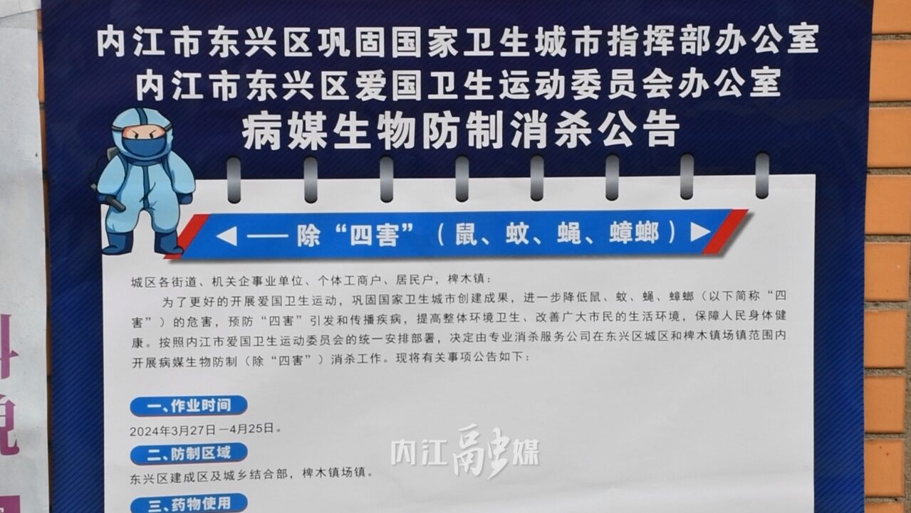 据了解,本次消杀时间为3月27日至4月25日。同时提醒广大市民,灭鼠毒饵站内所投放毒饵为国家允许使用的专用药物,对人畜低毒,但一定要看护好老人、小孩和宠物,严禁捡食毒饵。接触灭鼠毒饵后要及时用流水冲洗。若人或动物误食,请及时送医院诊治。同时也希望广大市民群众积极参与到病媒生物防制和爱国卫生运动中来,充分认识 “四害” 防制工作的重要性,增强卫生预防和自我保健意识,有效预防和控制各类传染病的发生与蔓延,共同营造一个干净、整洁、健康的生活环境。