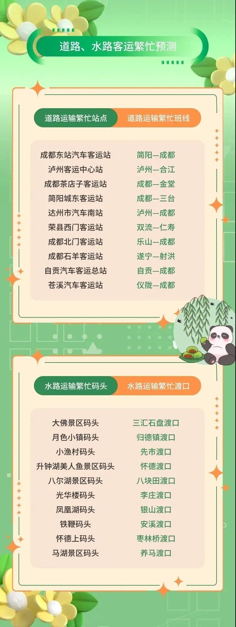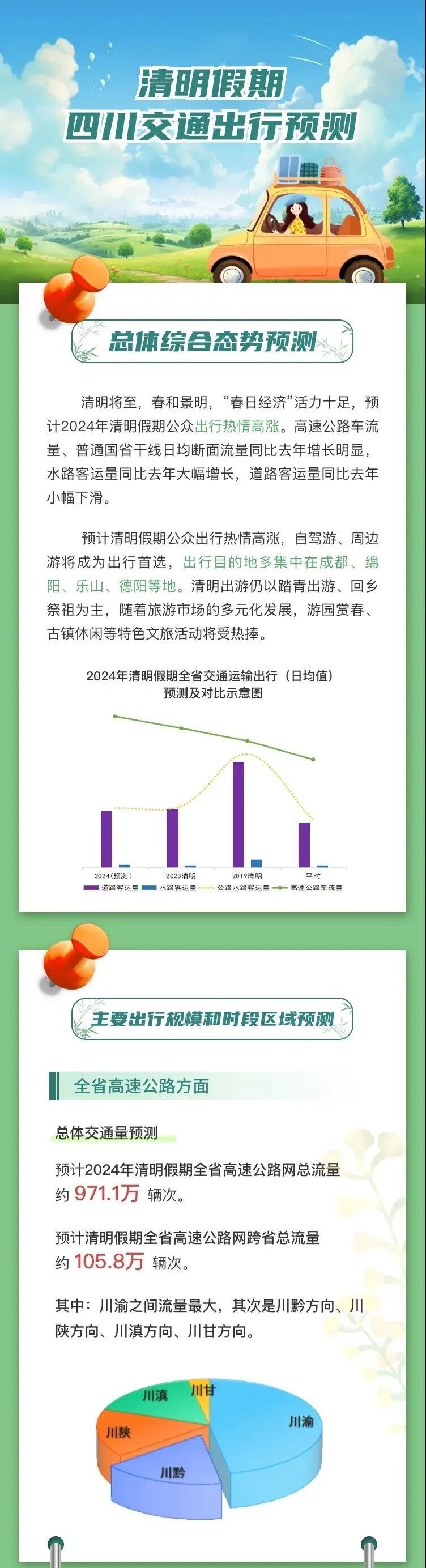 清明假期四川省公路水路交通运输总体综合态势呈现4个特点:一是公众出行热情高涨,同比去年增长明显;二是路网流量首日高峰,公水客运首尾偏低;三是近郊短途出游为主,赏花踏青热度攀升;四是盆地大部阴天为主,假期后段晴间多云。