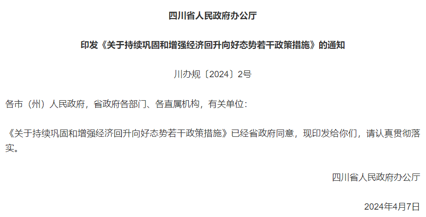 时间:2024-04-10 15:51:50 来源:四川省政府网近日,四川省人民政府办公厅印发《关于持续巩固和增强经济回升向好态势若干政策措施》的通知,详情如下。
