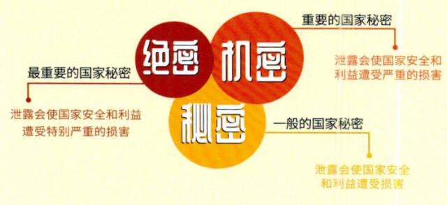 国家秘密的密级分为“绝密”、“机密”、“秘密”三级。“绝密”是最重要的国家秘密,泄露会使国家的安全和利益遭受特别严重的损害;“机密”是重要的国家秘密,泄露会使国家的安全和利益遭受严重的损害;“秘密”是一般的国家秘密,泄露会使国家的安全和利益遭受损害。