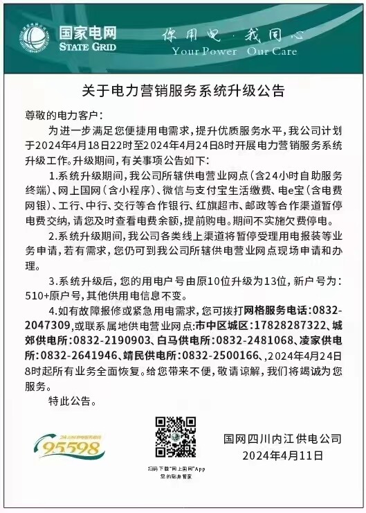 江粉儿从国网内江供电公司获悉,4月18日22时至4月24日8时,因电力营销服务系统升级,内江各供电营业网点、合作银行、小程序等电费充缴渠道将暂停电费缴纳服务。期间,各线上渠道也将暂停受理用电报装等业务申请。具体调整详情如下。