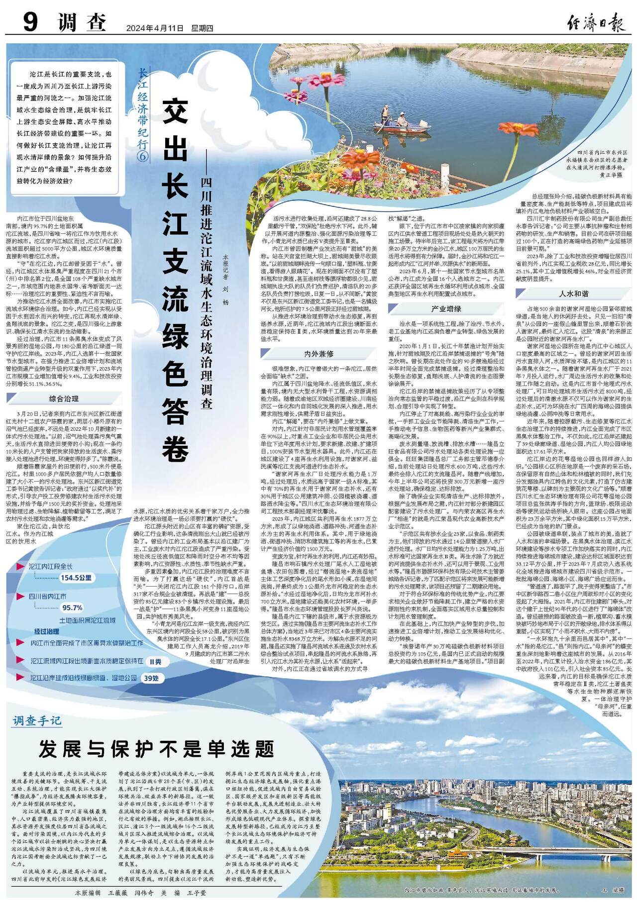 沱江是长江的重要支流,也一度成为四川乃至长江上游污染最严重的河流之一。加强沱江流域水生态综合治理,是筑牢长江上游生态安全屏障、高水平推动长江经济带建设的重要一环。如何做好长江支流治理,让沱江再现水清岸绿的景象?如何提升沿江产业的“含绿量”,并将生态效益转化为经济效益?