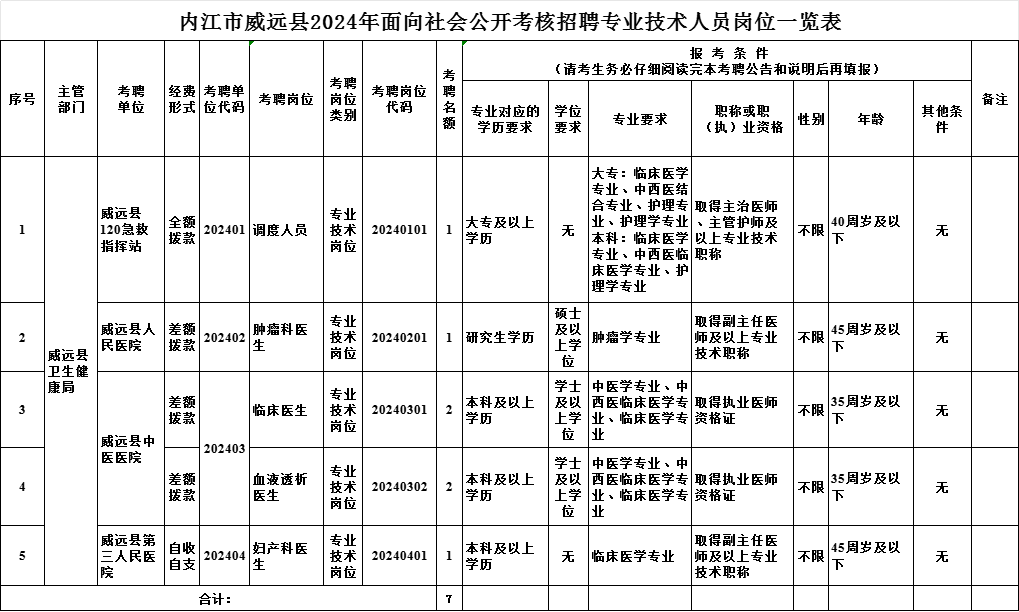 二、考核招聘单位及名额(考核招聘7名,详见附件1《内江市威远县2024年面向社会公开考核招聘卫生健康事业单位专业技术人员岗位一览表》。