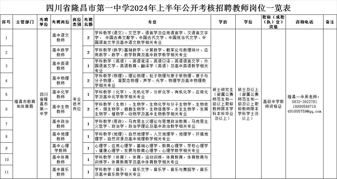 按照公开、平等、竞争、择优原则,四川省隆昌市第一中学(以下简称“隆昌一中”)面向全国公开考核招聘优秀教师 15名。