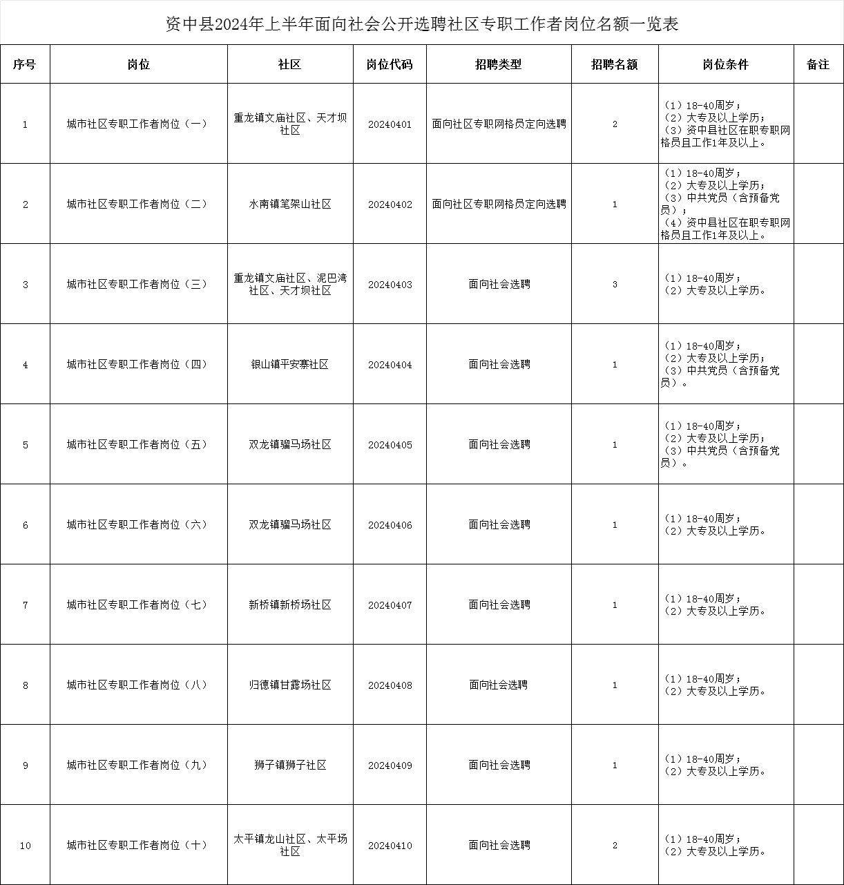 本次共选聘社区专职工作者14名,具体岗位、名额详见《资中县2024年上半年面向社会公开选聘社区专职工作者岗位名额一览表》。