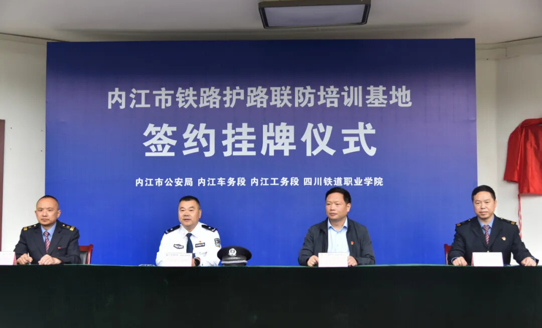 在当天的签约挂牌仪式上,内江市公安局、内江车务段、内江工务段、四川铁道职业学院四方签订协议,并为内江市铁路护路联防培训基地揭牌。