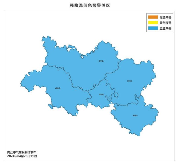内江市气象台2024年4月28日11时25分发布强降温蓝色预警:受冷空气影响,预计4月28日晚至5月1日我市将有一次明显降温降雨天气过程,日平均气温将累计下降7~8℃,最高气温将由31℃下降至18℃。其中28日晚到29日白天有雷阵雨,部分地方大雨,局部暴雨,个别地方有冰雹,并伴有6~7级大风,局部可达8级。请各地注意防范强降温、大风、强降水、局地冰雹等灾害性天气带来的不利影响。