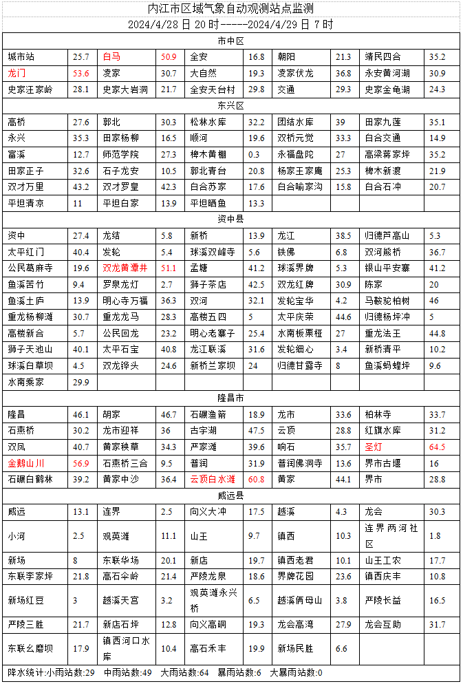 时间:2024-04-29 08:49:37 来源:内江市气象台刚刚,内江市气象台发布雨情通报及未来天气趋势预报,详情如下: