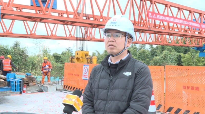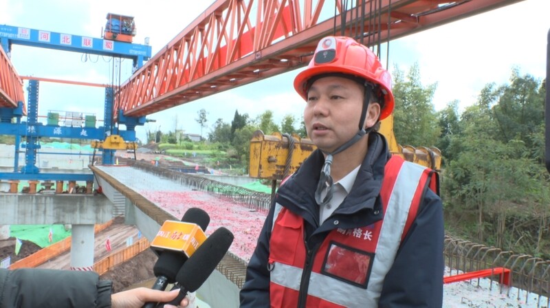 记者万丹丹介绍道:“我现在就在成渝高速扩容项目内江段箱梁架设现场。在我身后,工人正在紧张作业,随着架桥机缓缓移动,首片箱梁稳稳落进设计位置,标志着内江段正式从桥梁下部施工转向上部构造施工,项目建设迈入关键新阶段。”
