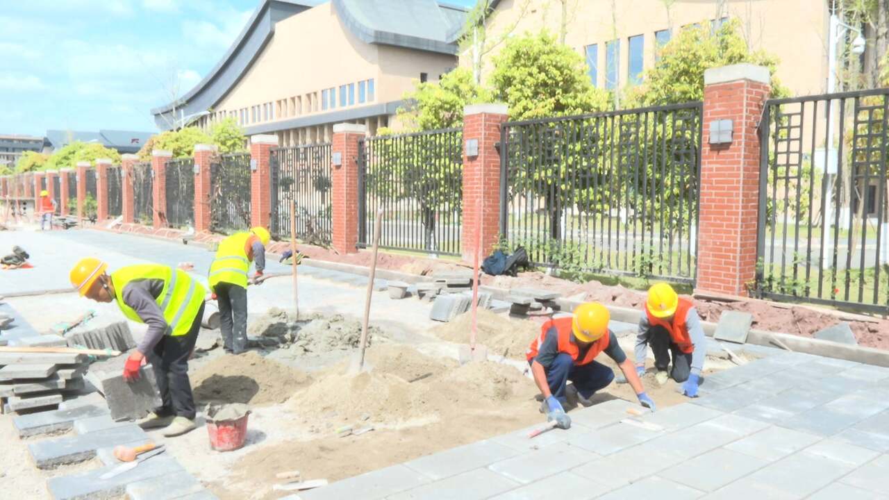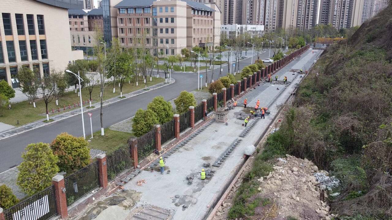 3月24日,记者来到位于内江师范学院正门口的临时摊区新建项目施工现场看到,30余名工人正紧锣密鼓地进行地面透水砖的铺设作业,现场一派忙碌景象。