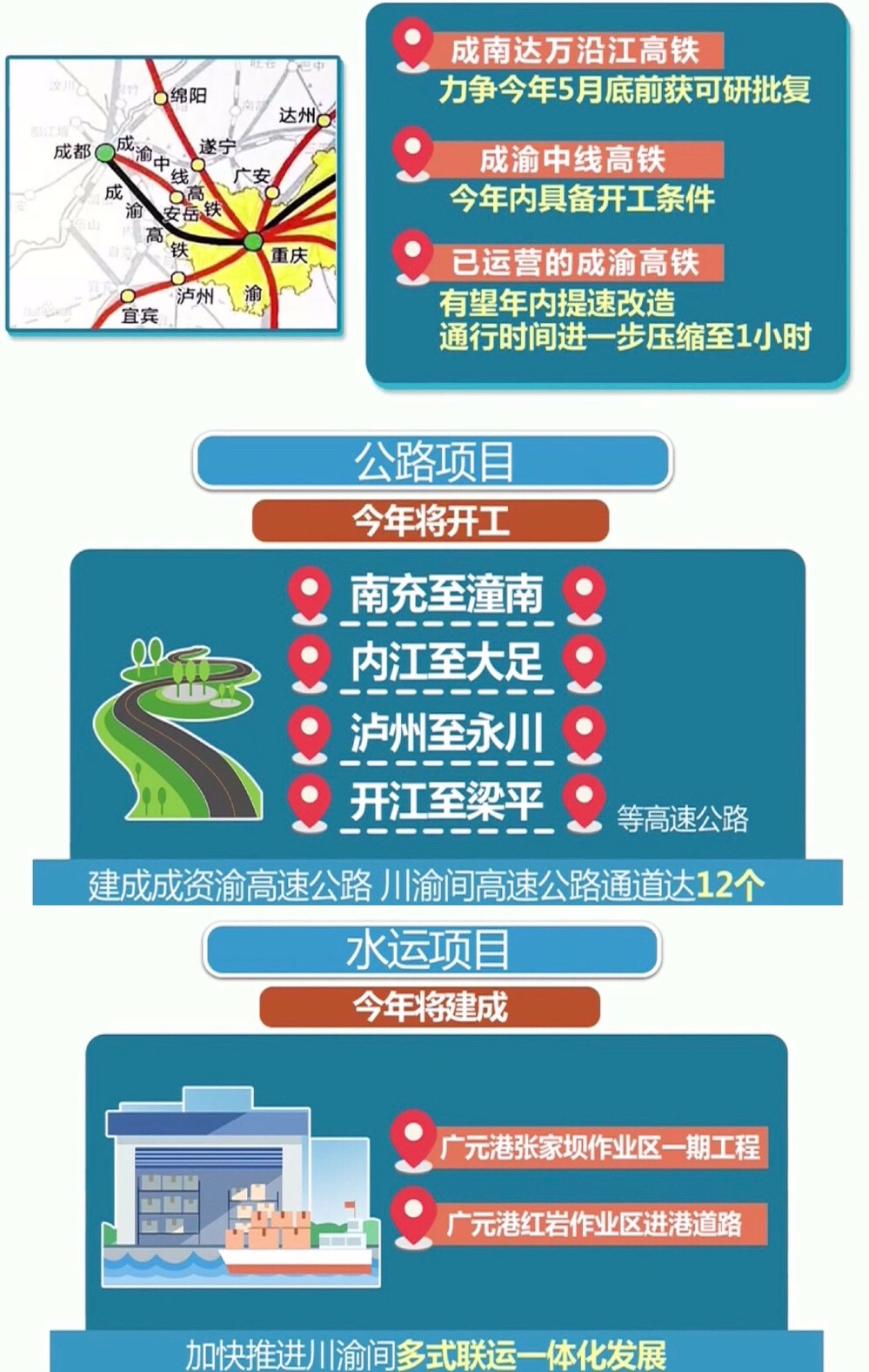 就在上周,两省市深化交通运输合作再度发力——今年将新开工及续建一批交通重大项目,其中备受瞩目的成南达万沿江高铁力争在今年5月底前获可研批复。到2025年,川渝间将形成17条以上高速公路通道,四级及以上航道总里程达到1700公里,港口集装箱吞吐能力达到300万标箱。