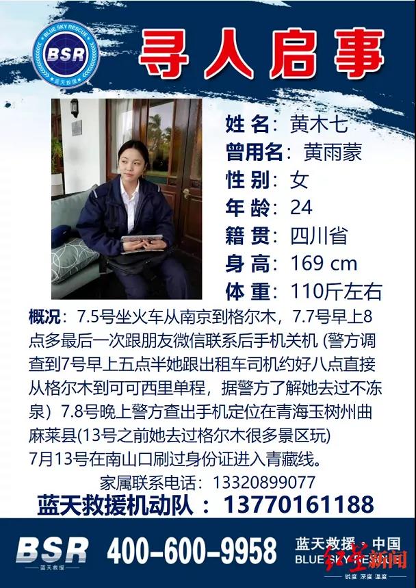 蔡队长介绍,蓝天救援队从黄雨蒙母亲及其姐姐处获悉,黄雨蒙是绵阳三台县人,今年24岁,在南京读大学,“很开朗的一个女孩。”因为毕业压力,黄雨蒙独自赴格尔木旅行。