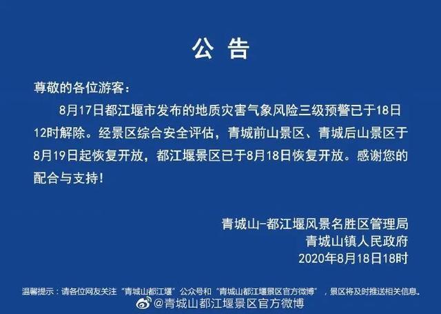据青城山都江堰景区官方微博消息,经综合安全评估,青城前山景区、青城后山景区于8月19日起恢复开放,都江堰景区已于8月18日恢复开放。