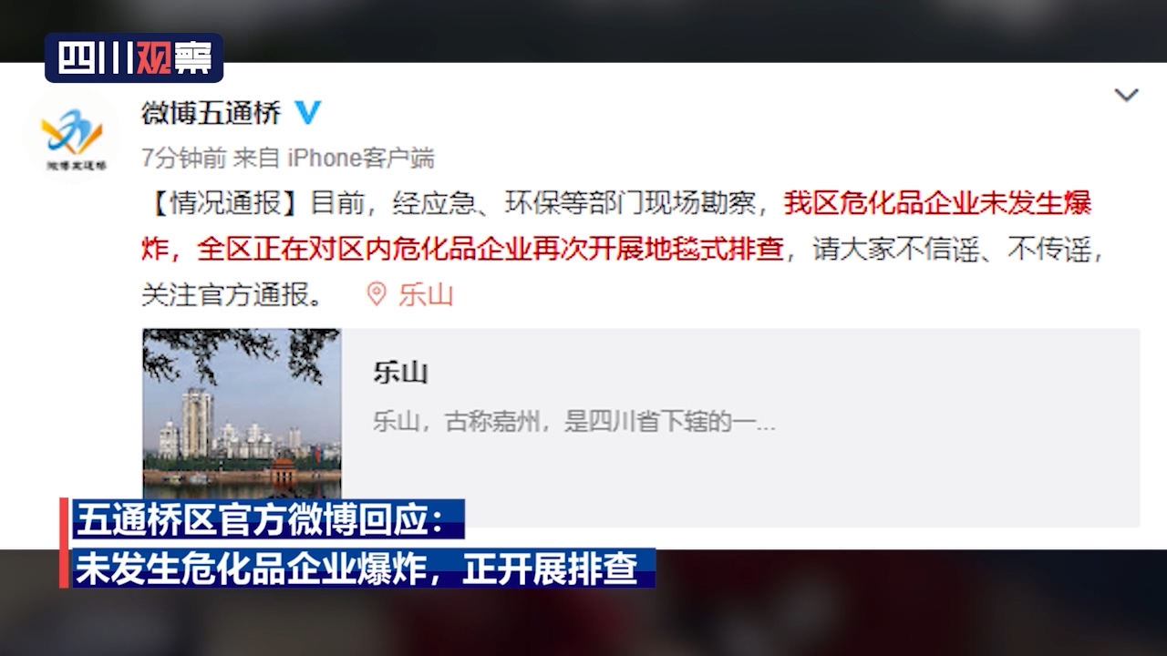 8月20日上午,四川省乐山市五通桥区中心城区产生异味浓雾。据五通桥区官方通报:目前经应急、环保等部门现场勘察,我区危化品企业未发生爆炸,全区正在对区内危化品企业再次开展地毯式排查。