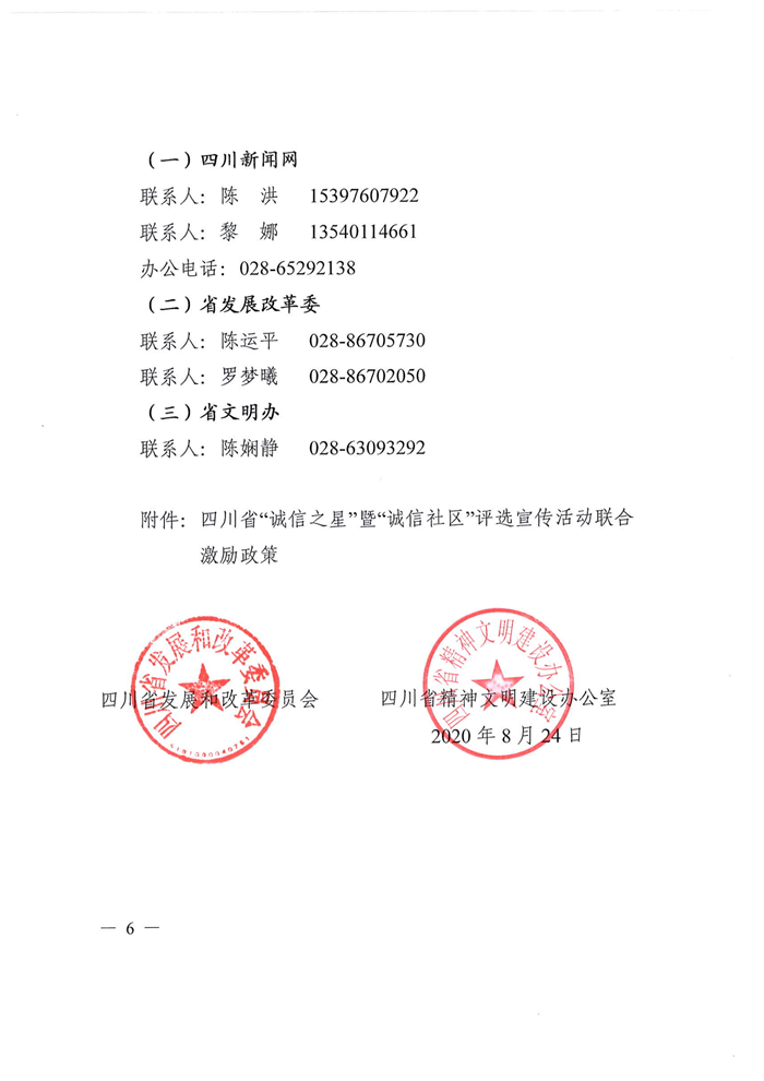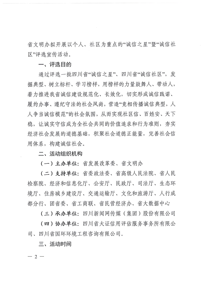 为贯彻落实中共中央、国务院印发的《新时代公民道德建设实施纲要》《关于加强和完善城乡社区治理的意见》文件精神,大力弘扬社会主义核心价值观,进一步提升公民道德素质和社会文明程度,全面提升城乡社区治理能力水平,8月28日,由省发展和改革委员会、省精神文明建设办公室主办的四川省“诚信之星”暨“诚信社区”评选宣传活动正式启动。此次活动得到了省委政法委、省高级人民法院、省人民检察院、省经济和信息化厅、省公安厅、省民政厅、省司法厅、省生态环境厅、省住房城乡建设厅、省交通运输厅、省文化和旅游厅、人行成都分行、团省委、省工商联、省民营经济办、省大数据中心等16家单位的大力支持,四川新闻网传媒集团对活动进行全程宣传推广。