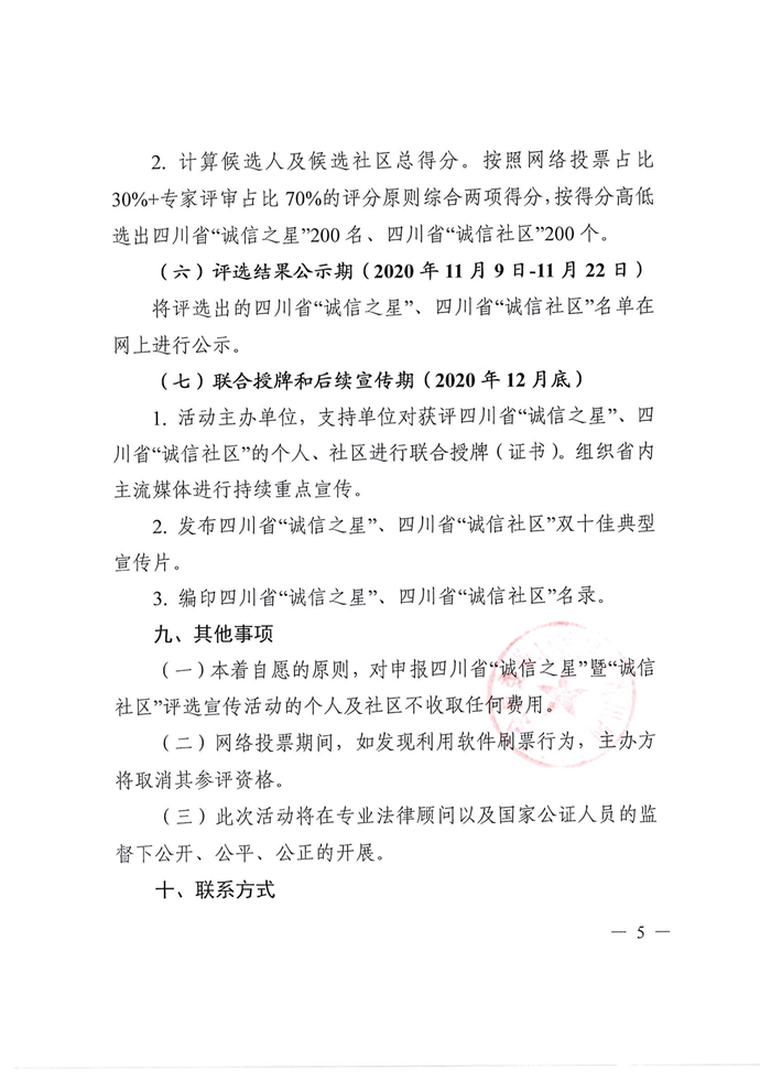 “诚信之星”暨“诚信社区”评选标准由主办单位、支持单位以及行业组织、专家根据四川省社会信用体系建设的相关标准和要求制定,专家评审组根据评选标准对参与网络投票的四川省“诚信之星”、四川省“诚信社区”进行打分。按照网络投票占比30%+专家评审占比70%的评分原则综合两项得分,按得分高低选出200名四川省“诚信之星”、200个四川省“诚信社区”,并在网上公示。活动主办单位、支持单位将对最终获评四川省“诚信之星”、四川省“诚信社区”的个人、社区进行联合授牌,并组织省内主流媒体进行持续重点宣传。