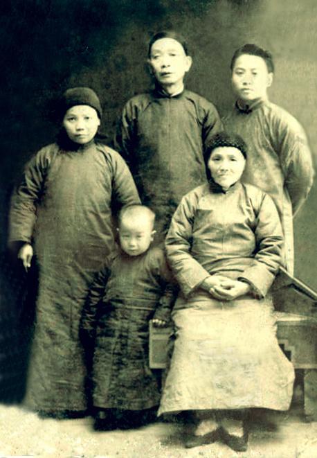 1938年,三岁的邱笑秋与外祖母、父母及家兄在成都拍的全家福