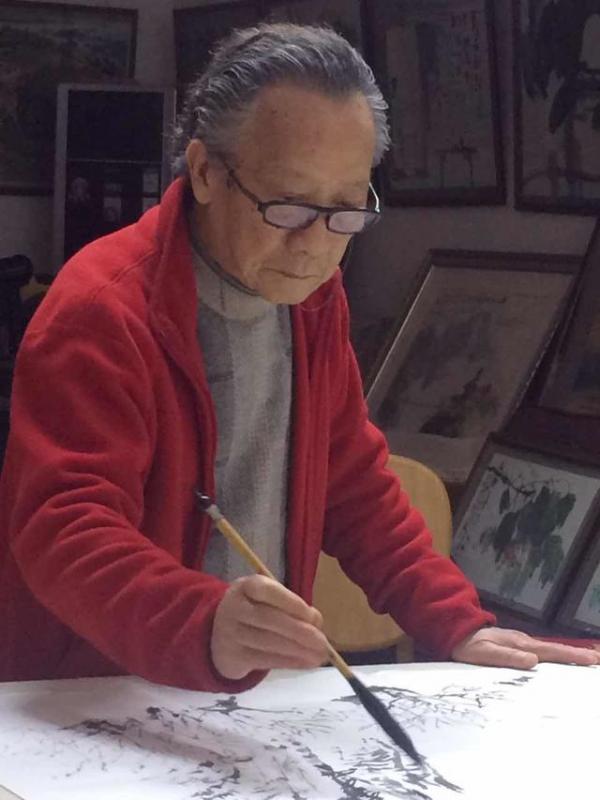 正在作画的邱笑秋,他认为绘画和戏剧有异曲同工之处