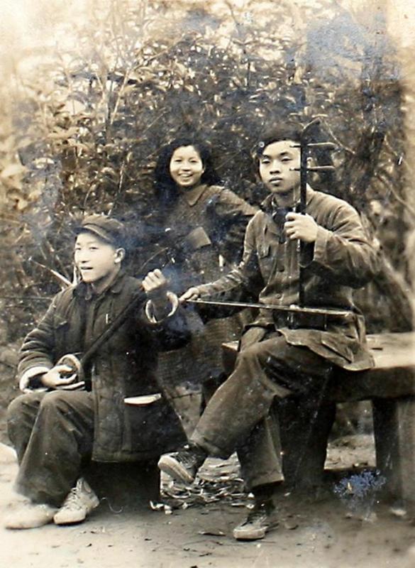 邱笑秋(左一)在弹三弦