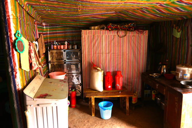 房顶和上段墙面铺着彩色塑料布,以挡风避雨;没有遮挡的下段墙面,裂痕清晰可见。屋中间的地面支着传统的彝家火塘,火塘一侧放着一排矮柜,柜门已损坏,斜斜支棱着。