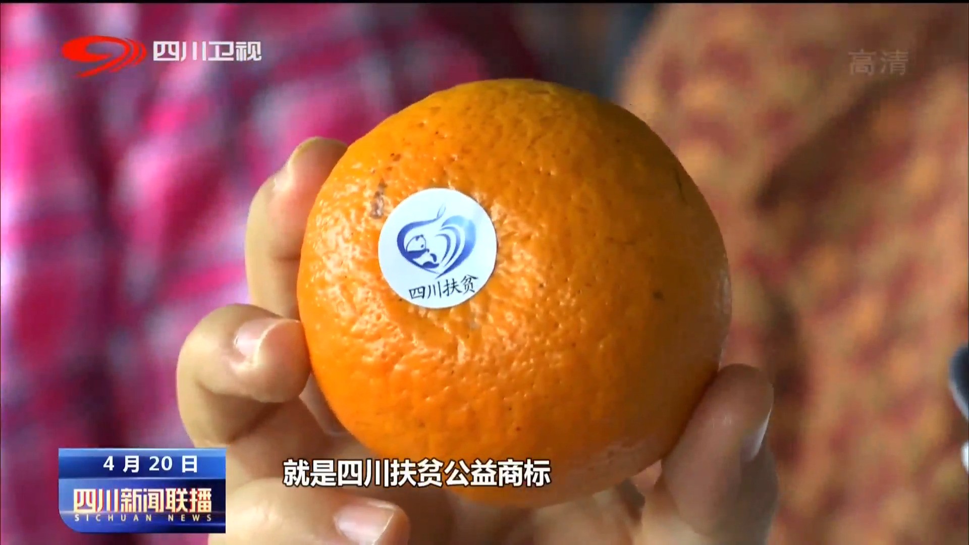 记者:我现在手上拿的这个柑橘上面这个蓝色的商标就是四川扶贫公益商标,它的设计整个呈现蓝色的底色,上面一只熊猫,整个辨识度是非常得高。