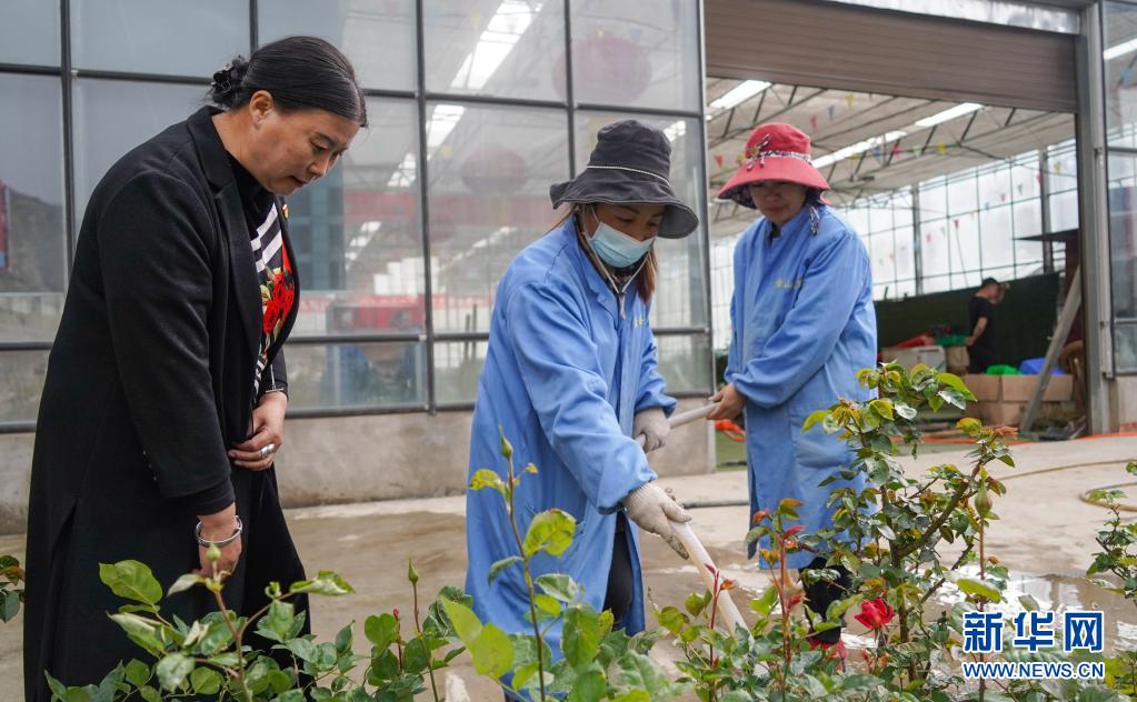 在金山玫瑰产业基地,陈望慧(左)在指导工人给玫瑰花浇水(4月14日摄)。