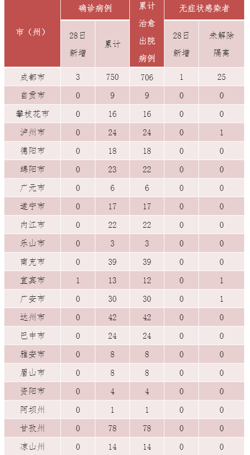 7月28日0-24时,四川新增新型冠状病毒肺炎确诊病例4例,其中3例为省外输入本土病例,1例为境外输入病例: