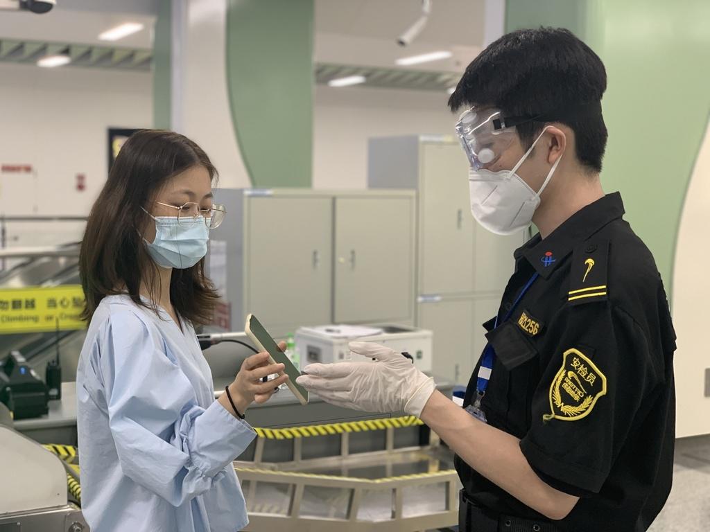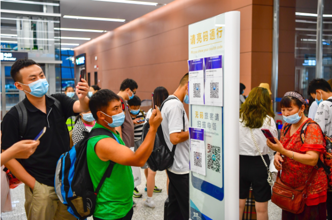 7月29日,天府国际机场,旅客扫码进航站楼。