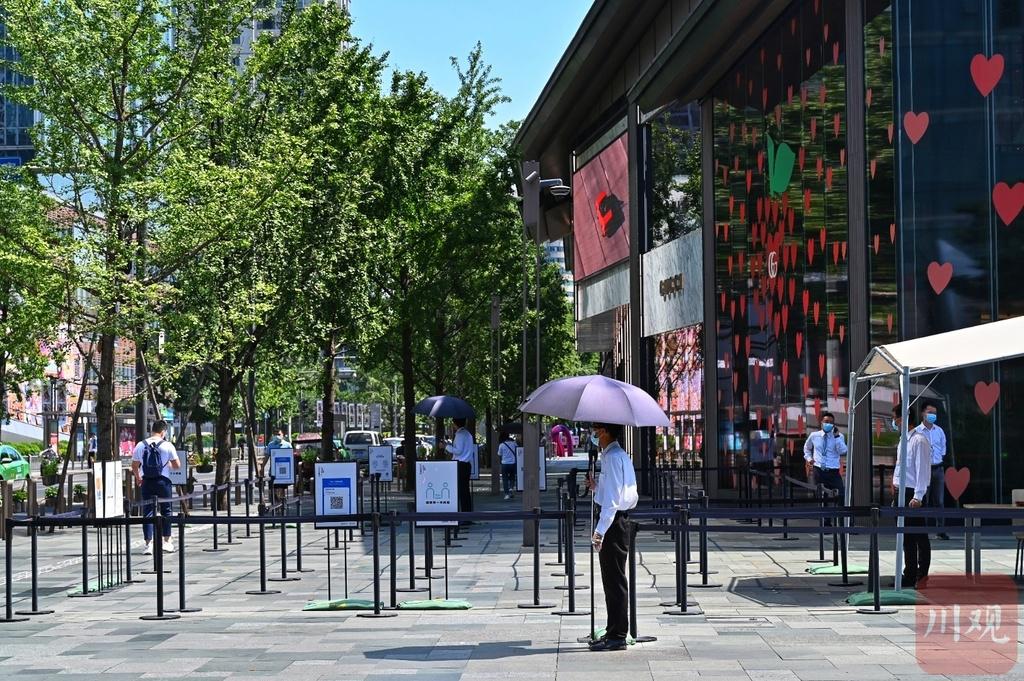 成都太古里入口严格扫码测体温进入(川观新闻记者 华小峰 摄影)