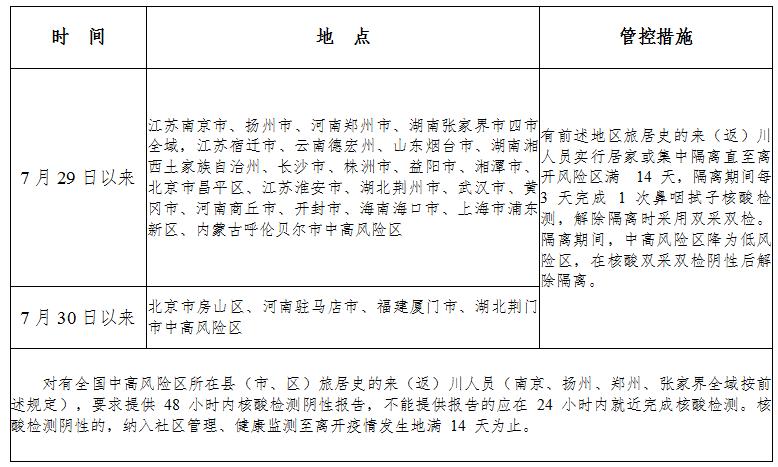 成都市要求学校做好开学和应急准备,落实好开学前14天自我健康管理和监测,所有师生员工开学前14天尽可能返回居住地,学校要准确了解掌握其14天的行程及身体健康状况,开学前14天内有国内中高风险地区及其所在区(市)县旅居史的人员,按要求完成核酸检测、隔离等措施后方可返校,严防带病带风险返校。