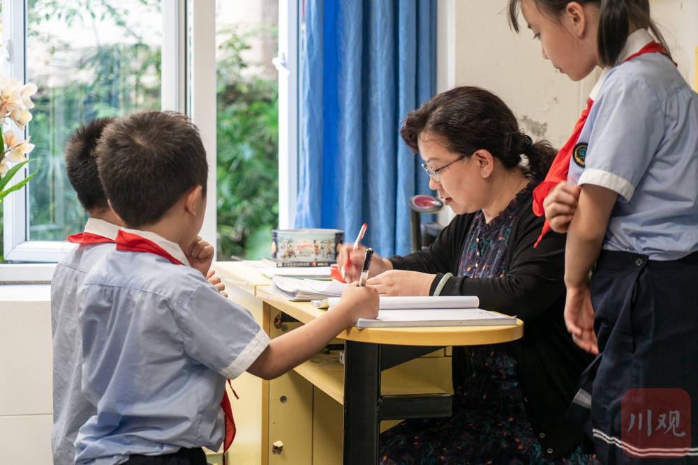 成都泡桐树小学三年级五班班主任孟会贤,正在延时服务为学生批改作业