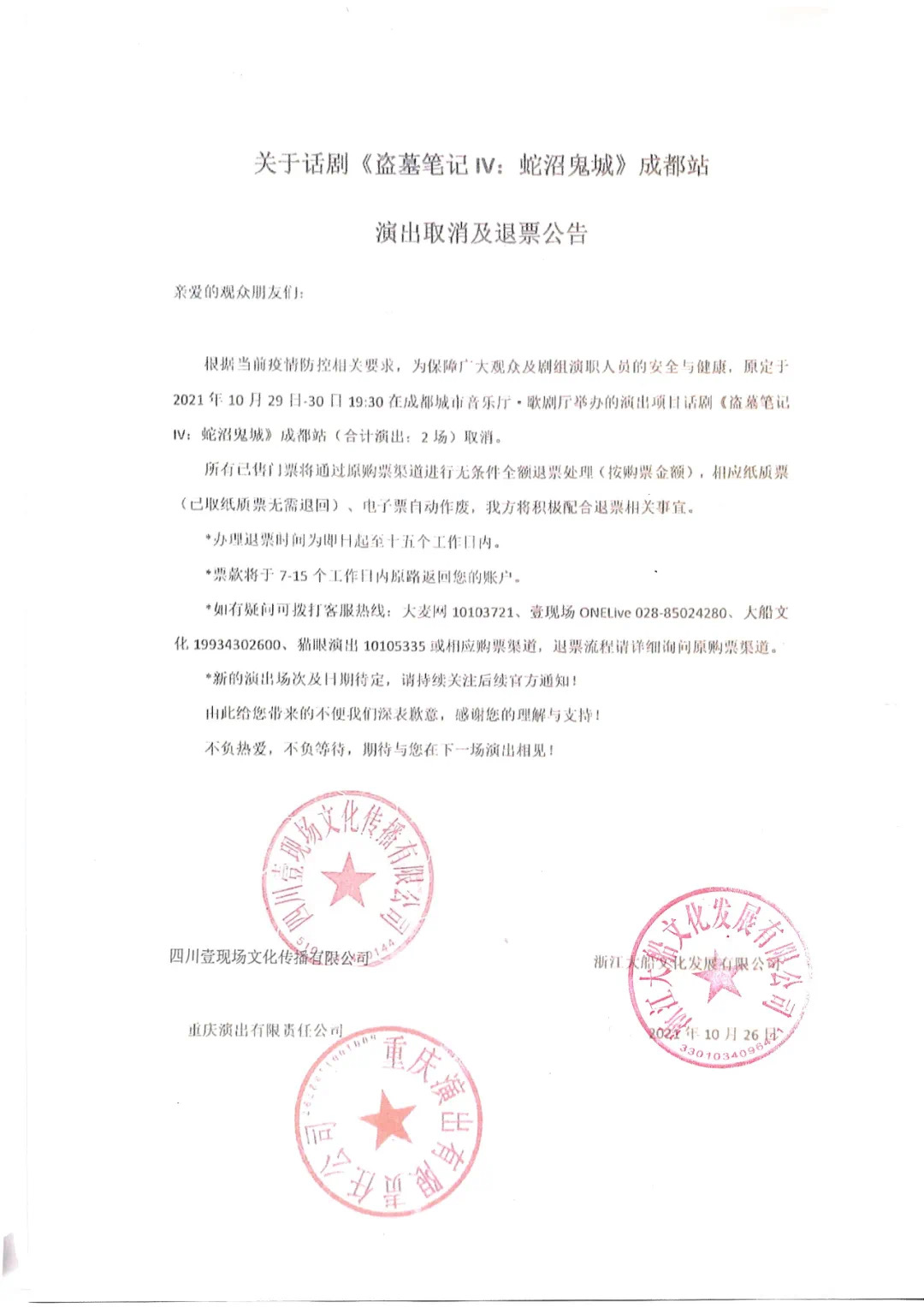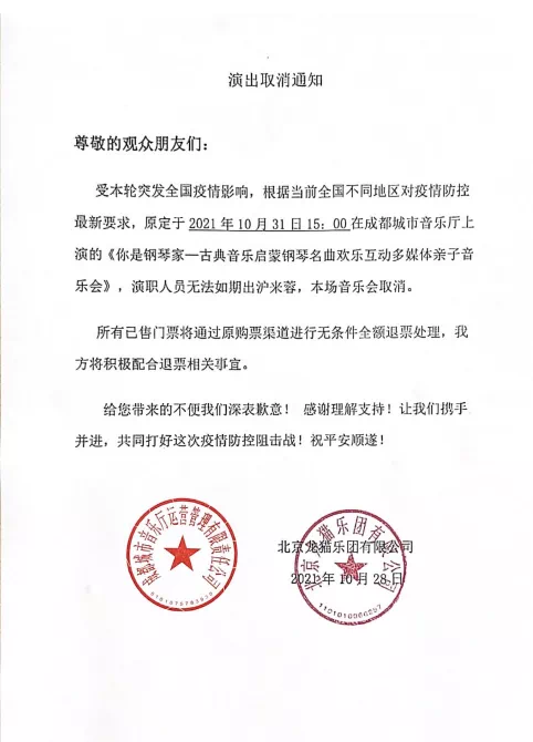 原定于2021年10月29日—30日于城市音乐厅歌剧厅演出的话剧《盗墓笔记IV:蛇沼鬼城》成都站、2021年10月31日于城市音乐厅演出的《你是钢琴家—古典音乐启蒙钢琴名曲欢乐互动多媒体亲子音乐会》取消!延期演出日期将另行通知。