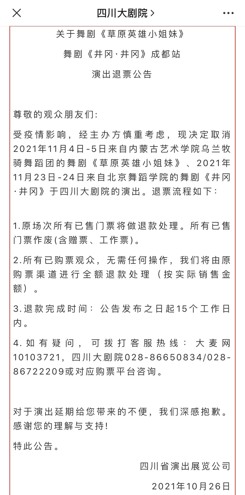原定于2021年11月4日-5日来自内蒙古艺术学院乌兰牧骑舞蹈团的舞剧《草原英雄小姐妹》、2021年11月23日-24日来自北京舞蹈学院的舞剧《井冈·井冈》于四川大剧院的演出取消!