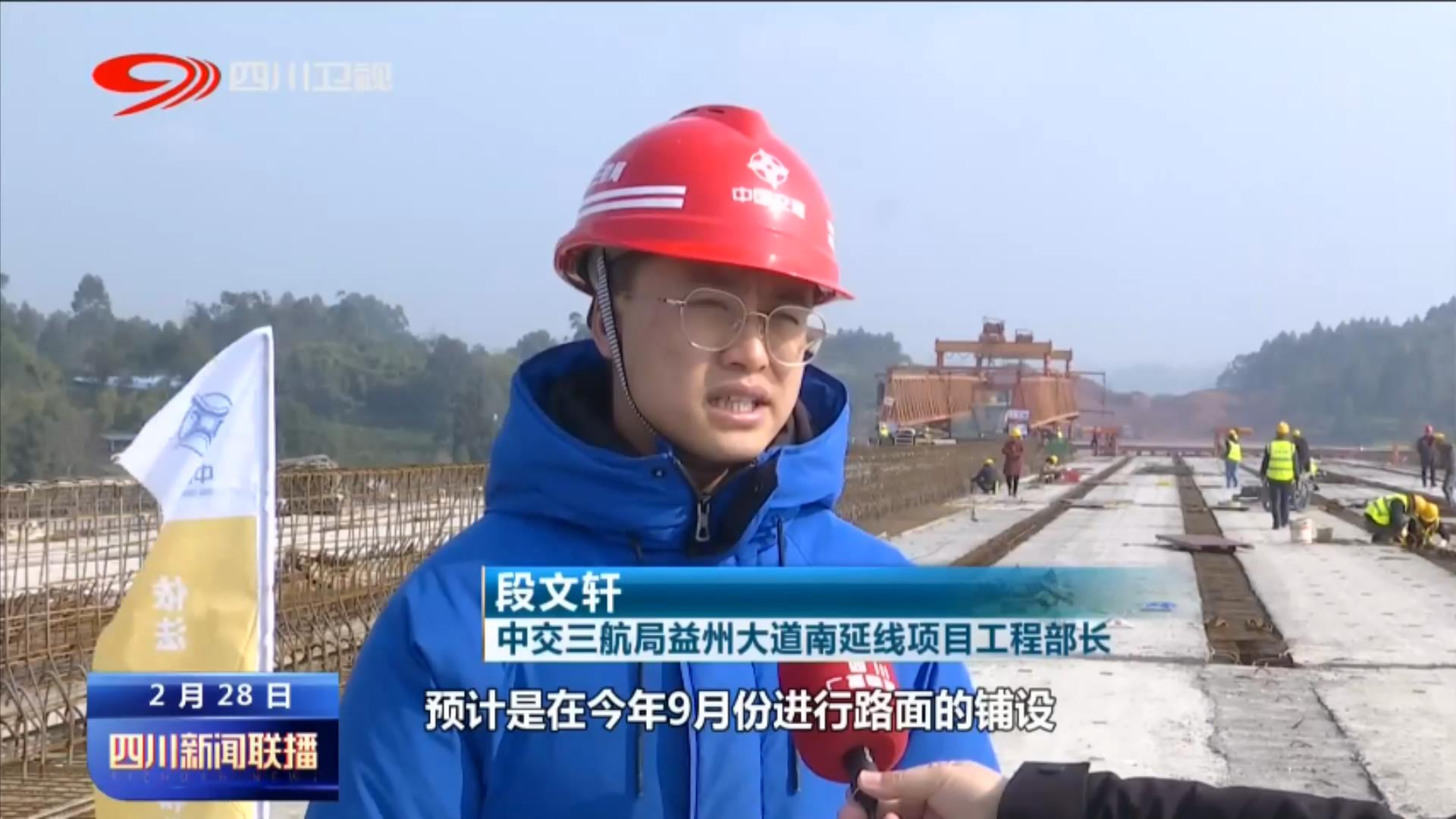 中交三航局益州大道南延线项目工程部长段文轩:我们预计是在今年9月份进行路面的铺设,以及交安绿化的安装工作,预计在12月底完成一个全线的贯通。