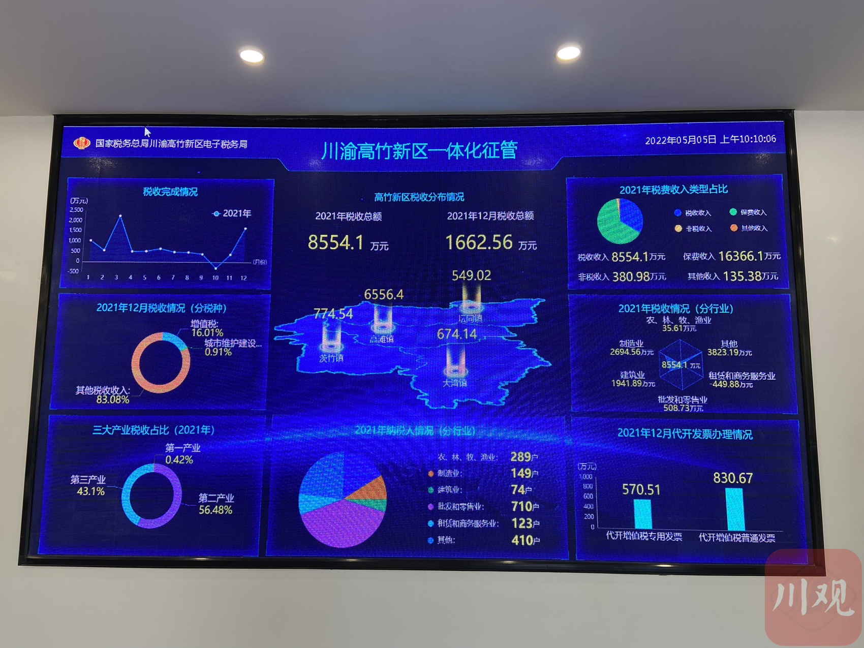 “税收分布情况、三大产业税收占比、纳税人情况……”走进川渝高竹新区税费征管服务中心,明亮的大厅内,一面LED幕墙上,各类数据以图表形式呈现,清晰明了;新型发票自助机、智能填表终端、模拟办税终端等15台智能终端设备呈环状排开,颇显科技范儿。