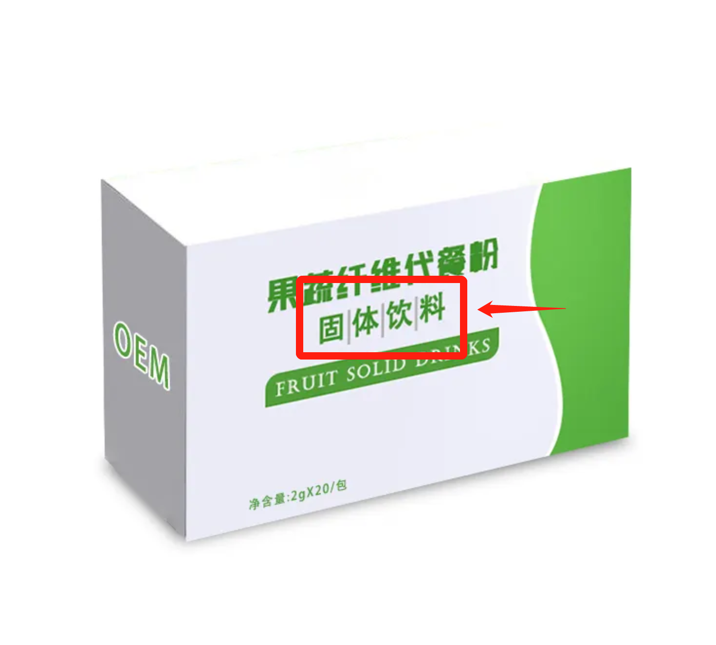 固体饮料产品名称不得与已经批准发布的特殊食品名称相同;应当在产品标签上醒目标示反映食品真实属性的专用名称“固体饮料”,字号不得小于同一展示版面其他文字(包括商标、图案等所含文字)。