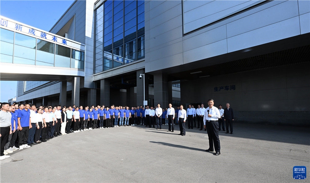6月8日,中共中央总书记、国家主席、中央军委主席习近平在四川考察。这是8日下午,习近平在宜宾市极米光电有限公司车间外广场,同企业员工们亲切交流。新华社记者 李学仁 摄